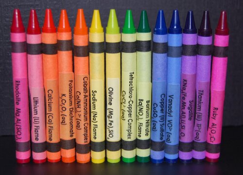 Children play and draw with crayons practically every day, so why not make the experience more educational? This listing is for a set of 48 labels to stick in the crayons in a basic 48 pack of crayons so that while children are coloring, they are also exposed to the names of chemicals that will make those colors! So instead of thinking "I want green" they will think "I want Barium Nitrate Ba(NO3)2 Flame" and then when they take chemistry in high school and their teacher sets some gas on fire and it makes a green color and they ask the class what chemical it was your student will know it was Barium! Genius!